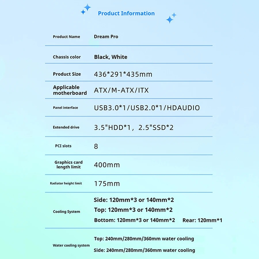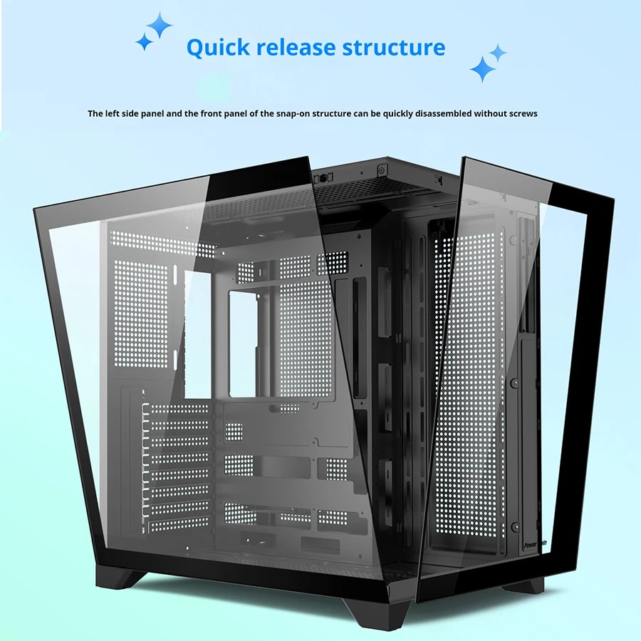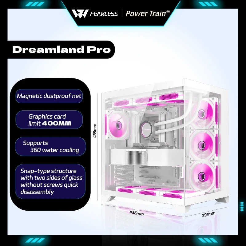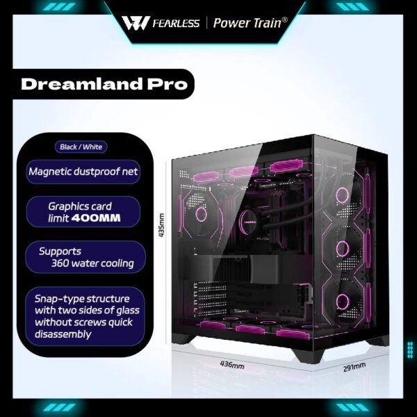 Power Train Dreamland PRO är ett exklusivt gamingchassi med panoramisk “scenic room”-design som visar upp ditt PC-bygge från flera vinklar. Med dubbla glaspaneler, stöd för 360 mm vattenkylning och bred moderkortskompatibilitet är det byggt för kraftfulla och visuellt imponerande system.