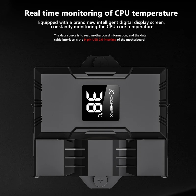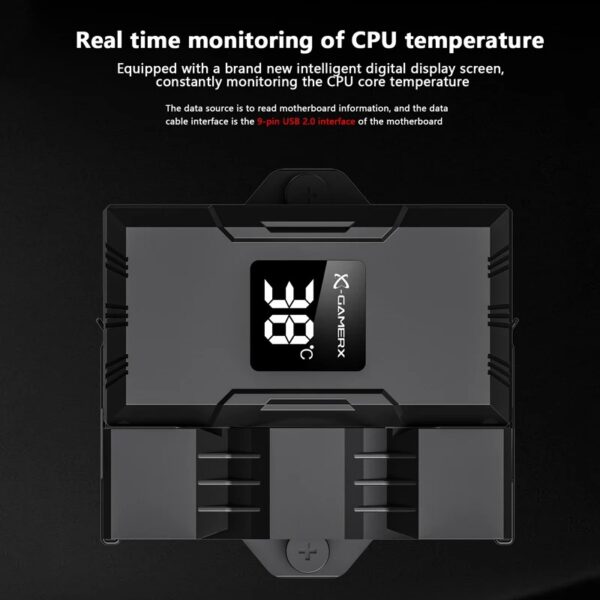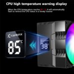 Denna CPU-luftkylare använder fyra värmerör i direktkontakt med processorn för snabb och effektiv värmeöverföring till kylflänsen. Den tysta 90 mm-fläkten (9 cm) ger stabil luftflöde medan ARGB-belysningen och den digitala temperaturdisplayen ger både estetik och realtidsinformation om systemets temperatur.